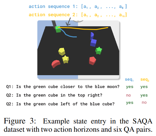 ๋ก๋ด ์ ์ด์์ ์๋ ๋ชจ๋ธ์ ๋ฏธ๋๋ฅผ ์์ธกํ์ฌ ๊ณํ์ ํ์ฉํ๋ ๊ฐ๋ ฅํ ๋๊ตฌ์ ๋๋ค. ์ ํต์ ์ผ๋ก ์๋ ๋ชจ๋ธ์ ํฝ์ ๋จ์์ ์์ ์์ธก์ ๋ชฉํ๋ก ํ์ต๋์์ต๋๋ค. ๊ทธ๋ฌ๋ ํฝ์ ์ฌ๊ตฌ์ฑ ๋ฅ๋ ฅ์ด ๊ณํ์ ์ฑ๋ฅ์ ๋ณด์ฅํ์ง๋ ์์ต๋๋ค. ์๋ฅผ ๋ค์ด, ๋ก๋ด์ด ๋ฌผ์ฒด๋ฅผ ์ง์ด ์ฌ๋ฆฌ๋ ์์ ์์๋ ๋ฌผ์ฒด์ ์ ํํ ๋ชจ์ ๋ณํ๋ณด๋ค โ๋ฌผ์ฒด๋ฅผ ์ง์๋์ง(yes/no)โ์ ๊ฐ์ ์๋ฏธ์ ์ ๋ณด๊ฐ ๋ ์ค์ํ ์ ์์ต๋๋ค. ์ด๋ฐ ๋ฌธ์ ์์์์ ์ ์๋ค์ ๋ฏธ๋์ ํฝ์ ์ ์์ธกํ๋ ๋์ , ์์ ์ ํ์ํ ์๋ฏธ์ ์ ๋ณด๋ง ์์ธกํ๋ฉด ์ถฉ๋ถํ๋ค๊ณ ์ฃผ์ฅํฉ๋๋ค. ์ฆ, ์๋ ๋ชจ๋ธ์ด ํด์ผ ํ ์ผ์ โํ์ด ๋ฌผ์ฒด์ ๊ฐ๊น์์ก๋๊ฐ?โ, โ๋นจ๊ฐ ๋ธ๋ก์ด ๋์ด์ก๋๊ฐ?โ, โํ๋ ํ๋ธ๊ฐ ์งํ๋๊ฐ?โ ๋ฑ์ ๋ฏธ๋ ๊ฒฐ๊ณผ์ ๋ํ ์ง๋ฌธ(Q&A)์ ์์ธกํ๋ ๊ฒ์ ๋๋ค.