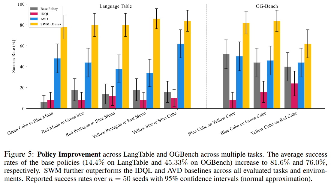 - ๋ฒ ์ด์ค ์ ์ฑ ํฅ์ (Policy Improvement): ๋ณด๋ค ๊น๋ค๋ก์ด ๊ณผ์ ์์๋, ๋จผ์ ๋ฒ ์ด์ค ์ ์ฑ (์: ํ์ฐ ์ ์ฑ )์ ์ฌ์ฉํด ํ๋ ๊ถค์ ์ ์์ฑํ ๋ค์, SWM๊ณผ ๊ทธ๋๋์ธํธ ๊ธฐ๋ฐ ์ต์ ํ๋ก ์ด๋ฅผ ๊ฐ์ ํ์ต๋๋ค. ๊ฒฐ๊ณผ๋ฅผ ๊ทธ๋ฆผ [15]์ ์์ฝํ์ต๋๋ค. SWM์ผ๋ก ์ ์ ํ ๊ถค์ ์ ๊ธฐ๋ณธ ์ ์ฑ ๋๋น ํ์ ํ ์ฑ๋ฅ ํฅ์์ ๋ณด์ฌ์ฃผ์๊ณ , ๋ ๊ฐ์ง ๋น๊ต ๋์์ธ IDQL(์คํ๋ผ์ธ RL)๊ณผ AVD(์ก์ ์กฐ๊ฑด ์์ ๋ํจ์ ) ๋ชจ๋๋ฅผ ๋ฅ๊ฐํ์ต๋๋ค. ์๋ฅผ ๋ค์ด LangTable๊ณผ OGBench์ ํ๊ท ์ฑ๊ณต๋ฅ ์ ๊ฐ๊ฐ ํฌ๊ฒ ์์นํ์ผ๋ฉฐ, ํนํ AVD์ IDQL์ ๋ชจ๋ ๊ณผ์ ์์ SWM์ ๋นํด ๋ฎ์ ์ฑ๋ฅ์ ๋ณด์์ต๋๋ค.