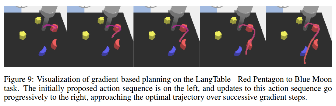 - ๊ทธ๋๋์ธํธ ๊ธฐ๋ฐ ๊ณํ (Gradient-Based Planning): ๋๊ท๋ชจ ๋ชจ๋ธ์์ ์ํ๋ง ๊ธฐ๋ฐ ๊ณํ์ ๊ณ์ฐ ๋น์ฉ์ ์ค์ด๊ธฐ ์ํด ์ ์๋ฉ๋๋ค. ๋ฒ ์ด์ค ์ ์ฑ (\pi_b)์์ ์์ฑ๋ ํ๋ณด ๊ถค์ (a \sim \pi_b(S))์ SWM๊ณผ ๊ทธ๋๋์ธํธ ๊ธฐ๋ฐ ์ต์ ํ๋ฅผ ์ฌ์ฉํ์ฌ ์ ์ ํฉ๋๋ค. ๋ชฉํ๋ ๊ฐ์น ํจ์ V_{T,c}(S, a)๋ฅผ ์ต๋ํํ๋ ์ก์ ์ํ์ค a๋ฅผ ์ฐพ๋ ๊ฒ์ ๋๋ค. J_T(a) = V_{T,c}(S, a)
