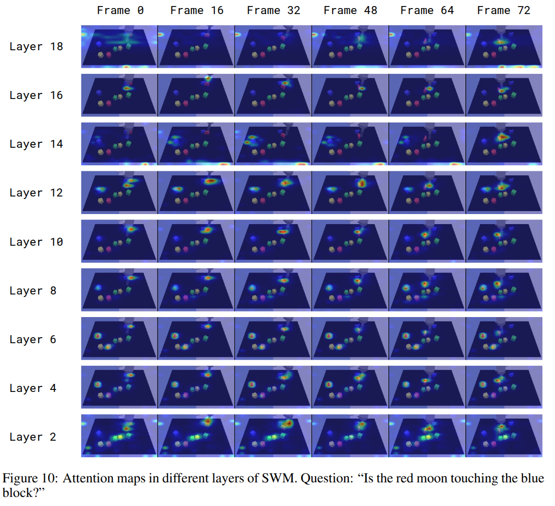 SWM์ ๊ด์ฐฐ-ํ๋-์ง๋ฌธ-์๋ต(state-action-question-answer, SAQA) ํํ๋ก ์ด๋ฃจ์ด์ง ๋ฐ์ดํฐ๋ก ์ง๋ํ์ต๋ฉ๋๋ค. ์๋ฎฌ๋ ์ดํฐ์์ ์์งํ ๊ถค์ (trajectory) ๋ฐ์ดํฐ์์ ์์์ ์๊ฐ ๊ฐ๊ฒฉ(horizon)์ ์ ํ์ฌ ํ๋์ ์ํ๋งํ๊ณ , ๊ทธ ๊ฒฐ๊ณผ๋ก ๋๋ฌํ ๋ฏธ๋ ์ํ๋ก๋ถํฐ ์ง๋ฌธ๊ณผ ์ ๋ต์ ์์ฑํฉ๋๋ค. ์๋ฅผ ๋ค์ด, ์ผ์ ์๊ฐ ํ ๋ฌผ์ฒด๊ฐ ์งํ๋์ง ๋ฌป๋ ์ง๋ฌธ์ ๋ํด ์ค๋ผํด ์ ๋ณด๋ก๋ถํฐ โyesโ ๋๋ โnoโ ์๋ต์ ์ป์ด ํ๋ จ ๋ฐ์ดํฐ๋ก ์ผ์ต๋๋ค. ์ฌ๋ฌ ํํ์ ์ง๋ฌธ์ผ๋ก ๋ฐํ๋ฒ(paraphrasing)์ ๋ค์ํํ์ฌ, ์ง๋ฌธ-๋ต๋ณ ์์ ํ๋ถํ๊ฒ ๋ง๋ญ๋๋ค. ์ด๋ ๊ฒ ์์ฑ๋ ๋ฐ์ดํฐ๋ก (์ด๋ฏธ์ง, ํ๋, ์ง๋ฌธ, ์ ๋ต) ์์ ํ์ต์์ผ SWM์ด ๋ฏธ๋ ๊ฒฐ๊ณผ๋ฅผ ์์ธกํ๋๋ก ํฉ๋๋ค.