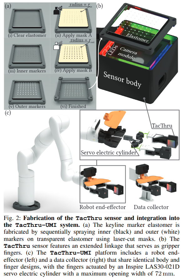 TacThru๋ ํฌ๋ช ํ elastomer, ์ง์์ ์ธ illumination, keyline marker tracking์ ํตํด ๋์์ ์ธ ์ด๊ฐ ๋ฐ ์๊ฐ ์ธ์์ ์ ๊ณตํ๋ STS ์ด๊ฐ ์ผ์์ ๋๋ค. TacThru-UMI ๋ชจ๋ฐฉ ํ์ต ํ๋ซํผ๊ณผ ํตํฉ๋์ด ๋ค์ํ ์กฐ์ ํ์คํฌ์์ ์ฐ์ํ ์ฑ๋ฅ์ ์ ์ฆํ๋ฉฐ, ๊ธฐ์กด ์ด๊ฐ ์ผ์ฑ์ ๊ทผ๋ณธ์ ์ธ ํ๊ณ๋ฅผ ํด๊ฒฐํ๊ณ ํ์ค vision ํ์ดํ๋ผ์ธ๊ณผ์ ํธํ์ฑ์ ์ ์งํฉ๋๋ค. ํฅํ ์ฐ๊ตฌ๋ก๋ synthetic tactile simulation๊ณผ ๊ฒฐํฉ๋ ๋๊ท๋ชจ ๋ฐ์ดํฐ ์์ง์ ํตํด specialized encoders์ pre-training์ ์ง์ํ๊ณ , TacThru์ ๋์ ์ผ์ฑ ๋ฅ๋ ฅ์ ์์ ํ ํ์ฉํ๋ ๋ณต์กํ๊ณ ์ฌ์ธํ ํ์คํฌ๋ฅผ ํ์ํ ๊ณํ์ ๋๋ค.