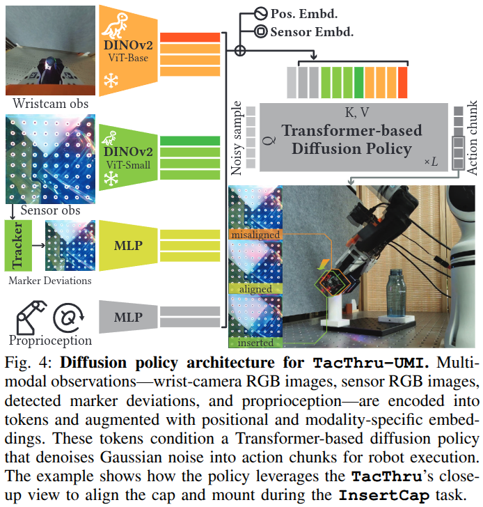 - ์ธ์ฝ๋: ์์ ์ ํธ๋ ์ต์ฒจ๋จ ๋น์ ์ธ์ฝ๋์ธ DINOv2(Vision Transformer)๋ก ์ฒ๋ฆฌํฉ๋๋ค. ์๋ชฉ ์นด๋ฉ๋ผ์ฉ ViT-Base์ TacThru์ฉ ViT-Small์ ๊ฐ๊ฐ ์ฌ์ฉํด ํ ํฐ์ ์ถ์ถํฉ๋๋ค. ์ด๊ฐ(๋ง์ปค ๋ณ์)๊ณผ ๊ด์ ๊ฐ์ MLP ๋คํธ์ํฌ๋ก ์ ์ฒ๋ฆฌํฉ๋๋ค. ๊ฐ ๋ชจ๋ฌ๋ฆฌํฐ ์ถ๋ ฅ์๋ ๋ณ๋์ ์๋ฒ ๋ฉ ๋ฒกํฐ(modality-specific embedding)๋ฅผ ๋ํด ํธ๋์คํฌ๋จธ๊ฐ ๊ฐ ๋ฐ์ดํฐ๋ฅผ ๊ตฌ๋ถํ๋๋ก ํฉ๋๋ค. ์ฆ, ๋ชจ๋ ๋ชจ๋ฌ๋ฆฌํฐ๊ฐ ํ๋์ ํธ๋์คํฌ๋จธ ์ ๋ ฅ ๋ฒกํฐ๋ก ๊ฒฐํฉ๋ฉ๋๋ค.