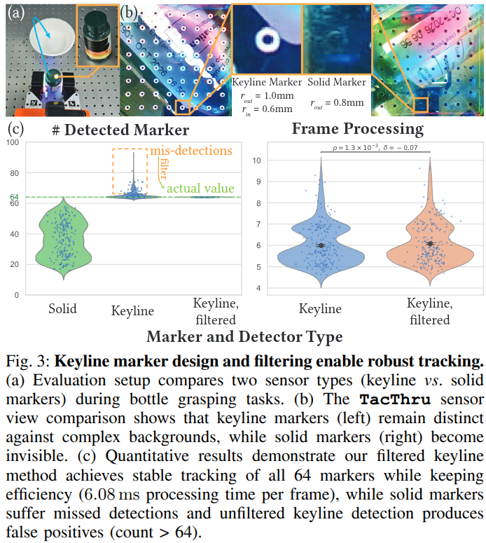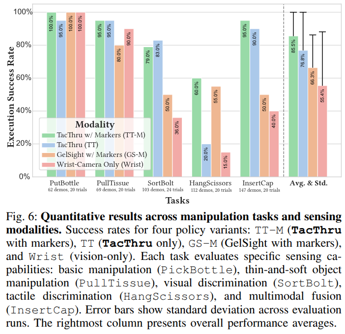 - ์ ๋ฐ์ ์ฑ๋ฅ: TacThru+๋ง์ปค ์ ์ฑ (TT-M)์ด ํ๊ท ์ฑ๊ณต๋ฅ 85.5%๋ฅผ ๊ธฐ๋กํด ๊ฐ์ฅ ์ฐ์ํ์ต๋๋ค. TacThru ์์๋ง(TT)์ ์ฝ 82%, GelSight+๋ง์ปค(GS-M) 66.3%, ์๋ชฉ ์นด๋ฉ๋ผ๋ง 55.4%์์ต๋๋ค. ์ฆ TacThru ์ผ์๋ฅผ ์ฌ์ฉํ๋ฉด ์ฝ 15โ30%p ๋์ ์ฑ๊ณต๋ฅ ์ ๋ณด์์ต๋๋ค.