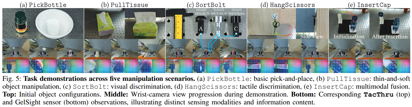 ๋ค์ฏ ๊ฐ์ง challengingํ ์ค์ ์ธ๊ณ ์กฐ์ ํ์คํฌ(PickBottle, PullTissue, SortBolt, HangScissors, InsertCap)์์ TacThru-UMI์ ์ฑ๋ฅ์ ํ๊ฐํ์ต๋๋ค.