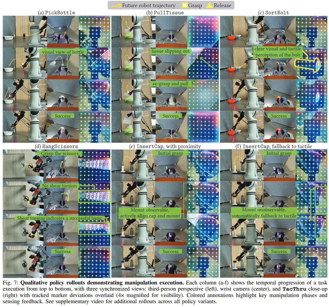 ์ด์์ ๊ฒฐ๊ณผ๋ ๊ทธ๋ฆผ 5-7์ ์ ๋ฆฌ๋์ด ์์ต๋๋ค. TacThru-UMI๋ ์ด๋ ค์ด ๊ณผ์ ์์ ๊ธฐ์กด ๋ฐฉ์๋ณด๋ค ํฌ๊ฒ ์์ฐ์ผ๋ฉฐ, ๊ฐ ๊ณผ์ ์์ ์๊ตฌ๋๋ ๊ฐ๊ฐ์ ํจ์จ์ ์ผ๋ก ํ์ฉํจ์ ์ ์ฆํ์ต๋๋ค. ํนํ TacThru์ ์ฐ์ ์๊ฐ ํผ๋๋ฐฑ ๋๋ถ์ ์ด๊ฐ ๊ฐ์ง ํ๊ณ๋ฅผ ๋์๊ณ , ์๊ฐ๊ณผ ์ด๊ฐ์ด ๋ณด์์ ์ผ๋ก ์ฌ์ฉ๋จ์ ํ์ธํ์ต๋๋ค.