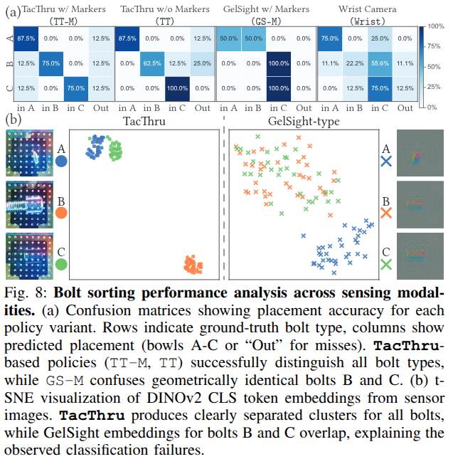 - SortBolt: ์๊ฐ์ ๊ตฌ๋ณ ํ์คํฌ๋ก, TacThru์ ๊ทผ์ ์์ผ(close-proximity view)๊ฐ ์์ ๋ณผํธ์ ๋ฏธ์ธํ ๊ธฐํํ์ ํน์ง๊ณผ ๋ฏธ๋ฌํ ์์ ์ฐจ์ด๋ฅผ ํฌ์ฐฉํ์ฌ GS-M์ด B์ C ๋ณผํธ๋ฅผ ํผ๋ํ๋ ๊ฒ๊ณผ ๋ฌ๋ฆฌ, TT-M๊ณผ TT๋ ๋ชจ๋ ๋ณผํธ ์ ํ์ ์ฑ๊ณต์ ์ผ๋ก ๊ตฌ๋ณํ์ต๋๋ค. DINOv2 ์๋ฒ ๋ฉ ๋ถ์ ๊ฒฐ๊ณผ, TacThru๋ ๋ช ํํ๊ฒ ๋ถ๋ฆฌ๋ feature clusters๋ฅผ ์์ฑํ๋ ๊ฒ์ผ๋ก ๋ํ๋ฌ์ต๋๋ค.