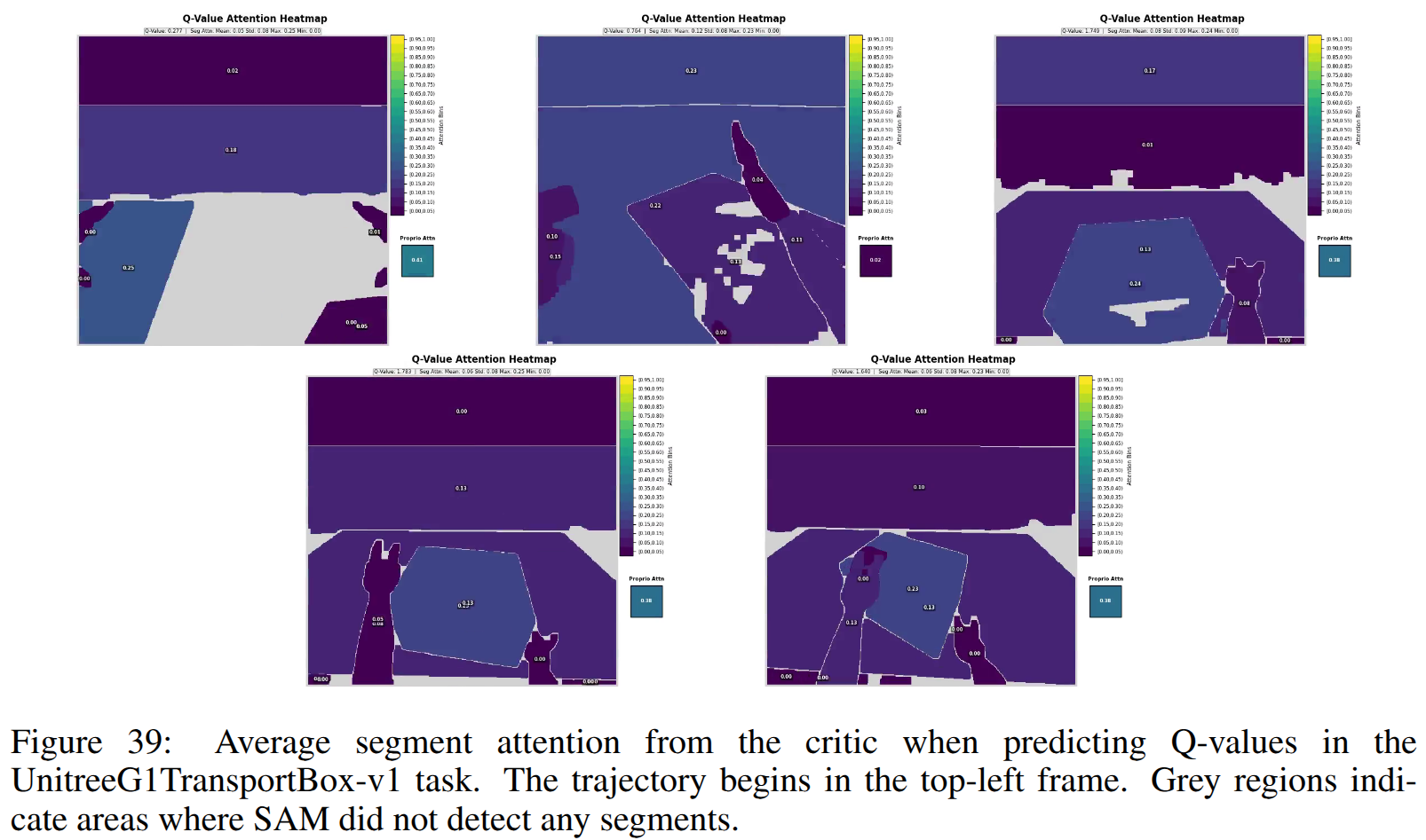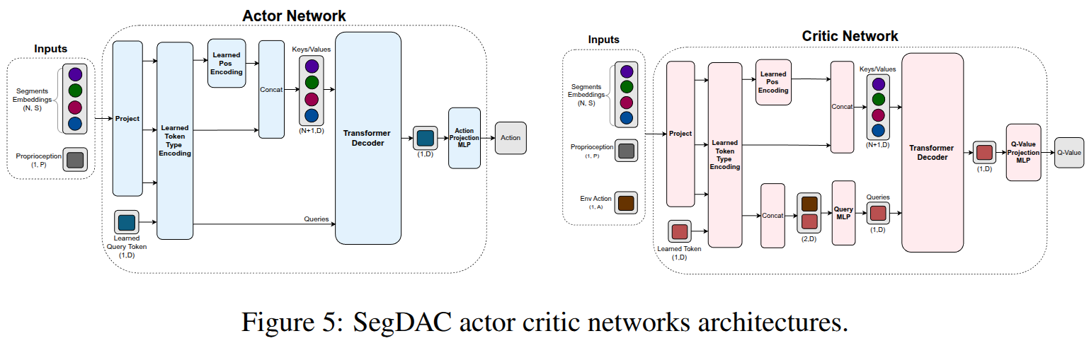 - Critic ๋คํธ์ํฌ์ ๊ฒฝ์ฐ, query๋ action vector์ ํ์ต๋ ํ ํฐ์ concatenateํ๊ณ MLP๋ฅผ ํตํด ํฌ์ํ์ฌ ํ์ฑ๋ฉ๋๋ค. Keys์ values๋ ์ธ๊ทธ๋จผํธ ํ ํฐ, proprioception ํ ํฐ, ํ์ต๋ ํ ํฐ์ ์งํฉ์ ํฌ์ํ์ฌ ์ป์ต๋๋ค. ๋์ฝ๋๋ ์ด ์งํฉ์ ์ดํ ์ (attention)์ ์ ์ฉํ์ฌ ๋จ์ผ ์ถ๋ ฅ ํ ํฐ์ ์์ฑํ๋ฉฐ, ์ด๋ projection head๋ฅผ ํตํด Q-value๋ก ๋งคํ๋ฉ๋๋ค.