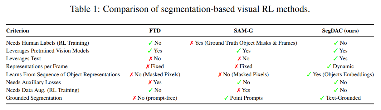 - ๐ก SegDAC๋ ์๊ฐ์ ๊ฐํ ํ์ต(RL)์ ์ํด Segment Anything(SAM)๊ณผ YOLO-World๋ฅผ ํ์ฉํ์ฌ ๋์ ์ด๊ณ ๊ฐ๋ณ์ ์ธ ์์ ๊ฐ์ฒด ์ค์ฌ ํํ์ ์ถ์ถํ๋ ์๋ก์ด Transformer ๊ธฐ๋ฐ Actor-Critic ๋ฐฉ๋ฒ์ ์ ์ํฉ๋๋ค.