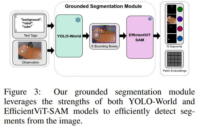 - ์ด ๋ฐ์ด๋ฉ ๋ฐ์ค๋ค์ EfficientViT-SAM (SAM) ๋ชจ๋ธ์ ํ๋กฌํํธ(prompts)๋ก ์ฌ์ฉ๋์ด ๊ฐ ๋ฐ์ค ๋ด์์ ์ธ๊ทธ๋จผํธ ๋ง์คํฌ(segment masks)์ ํจ์น ์๋ฒ ๋ฉ(patch embeddings)์ ์์ฑํฉ๋๋ค. SAM๊ณผ YOLO-World๋ ํ์ต ๊ณผ์ ์์ frozen ์ํ๋ก ์ ์ง๋ฉ๋๋ค.