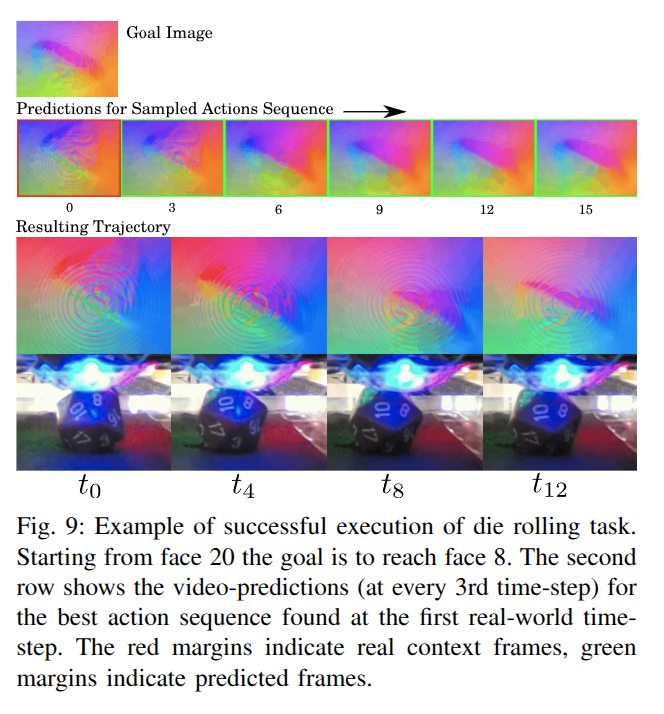 - ๋ฐ์ดํฐ ์์ง (Autonomous Data Collection): ๋ก๋ด์ ball, analog stick, 20-sided die์ ๊ฐ์ ๋ฌผ์ฒด์ ๋ฌด์์ ์์ง์์ ํตํด ์์จ์ ์ผ๋ก ์ํธ์์ฉํ๋ฉฐ ๋๋์ ์ด๊ฐ ์ด๋ฏธ์ง ์ํ์ค์ ํด๋น ์ก์ ๋ฐ์ดํฐ๋ฅผ ์์งํฉ๋๋ค. ์๋ฅผ ๋ค์ด ball repositioning task์์๋ 7400๊ฐ์ ๊ถค์ , analog stick task์์๋ 3000๊ฐ, die rolling task์์๋ 4500๊ฐ์ ๊ถค์ ์ด ์์ง๋์์ต๋๋ค. ๊ฐ ๊ถค์ ์ 15~18 ํ์์คํ ์ผ๋ก ๊ตฌ์ฑ๋๋ฉฐ, ์ผ์์ x, y, z ๋ฐฉํฅ์ผ๋ก ยฑ6.0 mm์ ๋ฌด์์ ์์ง์์ด ์ ์ฉ๋ฉ๋๋ค. ์ก์ ์ 3 ํ์์คํ ๋์ ๋ฐ๋ณต๋์ง๋ง, ์ด๋ฏธ์ง๋ ๋งค ํ์์คํ ๋ง๋ค ๊ธฐ๋ก๋์ด ๋ถ์ฐ์์ ์ธ ๋์ญํ ํ๊ฒฝ์์ ๋ชจ๋ธ ์์ธก ์ ํ๋๋ฅผ ๋์ ๋๋ค.