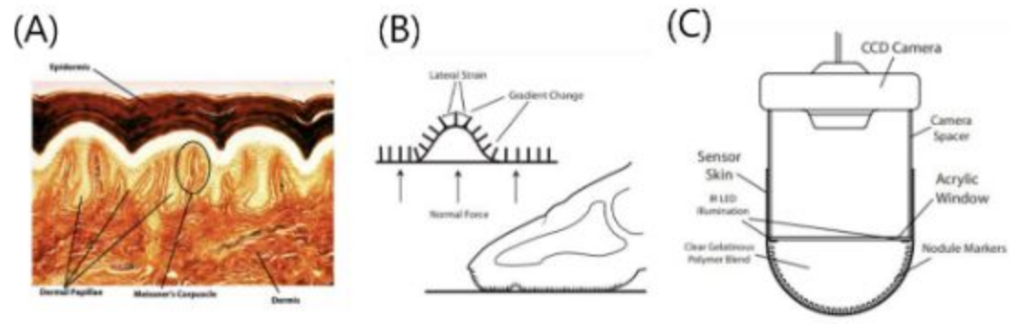 그림 2. (A) 대표적인 mechanoreceptor인 마이스너 소체의 생김새와 위치, (B) 마이스너 소체를 모방한 마커의 움직임 예시, (C) TacTip의 단면 이미지 (이미지 출처: 4)