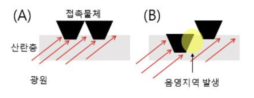 그림 3. (A) 얕은 접촉의 경우 측정에 문제없으나, (B) 깊은 접촉의 경우 음영영역이 발생한다.